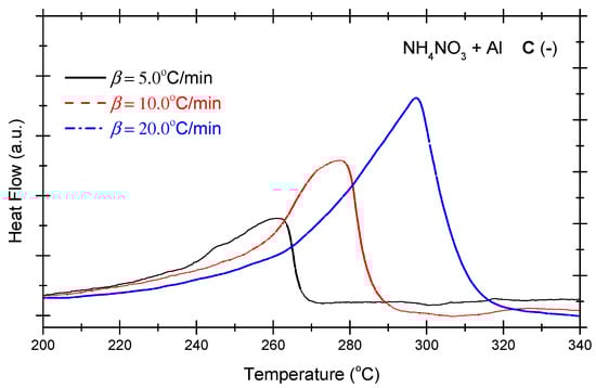 In the past decade, thermal analysis has been widely used in a wide range of fields, including inorganic substances [18], pigments [19], explosives [20,21,22], energetic materials [23,24,25,26], polymers [27,28,29,30,31,32], nanocomposites [33], and biomass materials [34,35]. The main techniques used for sample measurements are differential scanning calorimetry (DSC), thermogravimetric analysis (TGA), and dynamic mechanical analysis (DMA). In special cases, combined on-line techniques such as evolved gas analysis and visual monitoring have also been employed. In this study, the authors utilized DSC to analyze the thermal hazard characteristics of two non-ideal explosives based on ammonium perchlorate/ammonium nitrate, and aluminium powder.