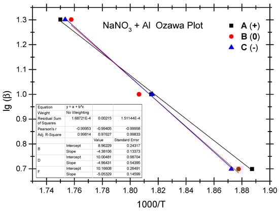 The Ozawa method and the Kissinger method are used to calculate the thermokinetic parameters of the ammonium nitrate-aluminium system under different OB conditions. In Table 4, Ozawa fitting is conducted using the peak temperatures (Tp) corresponding to the different heating rates (β). As shown in Figure 5, a simple linear fit of 1 gβ vs. 1000/Tp is performed. Similarly, Figure 6 presents the simple linear fit of ln(β/Tp2) vs. 1000/Tp based on the relevant peak temperature data and the Kissinger method. As seen in Figure 5 and Figure 6, the fitted line shows a very good linear correlation. The thermokinetic parameters of the ammonium nitrate-aluminium system are computed using the Ozawa function (2) and the Kissinger function (3), respectively, as shown in Table 5.