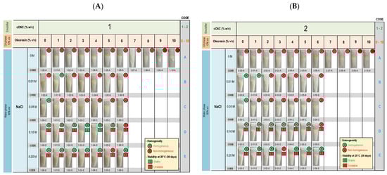 Physical appearance of DA oleoresin Pickering emulsion with 1% cCNC (A) and 2% cCNC (B) as emulsifier. The emulsions were formulated by varying the oleoresin ratio in the oil phase (10% total) and NaCl in the water phase (90%). Following preparation and storage (25 °C for 30 days), the physical stability of the emulsions was assessed through visual observation.