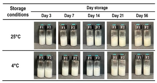 The physical changes in Pickering emulsions F1 and F2 during storage at 25 °C and 4 °C for 56 days.