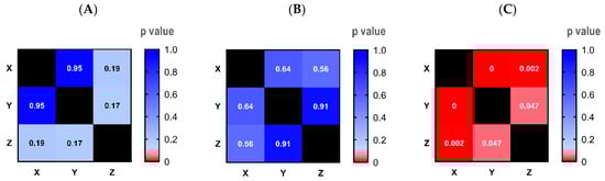 Homogeneity test by image analysis. Homogeneity was assessed via image analysis, comparing the intensity of areas X, Y, and Z among formulations F1 (A), F2 (B), and formulation 1-01-A (used as a positive control) (C). A higher p-value indicates increased uniformity among these areas.