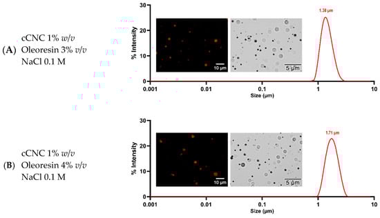 Pickering Emulsion from DA oleoresin was prepared according to a previous report [11] with minor modifications. Briefly, the oil-in-water solution (1:9 v/v ration) was mixed with cCNC and sonicated by an ultrasonic bath (Model Lab855, Sl Analytics, Washington, DC, USA). Pickering emulsion of oleoresin (o/w) emulsion was then optimized for the concentrations of cCNC, NaCl, and oil phase (plant oil and oleoresin). The optimal formulations were determined based on homogeneity and physical stability. The emulsion compositions formulated in this study are displayed in Table 3.