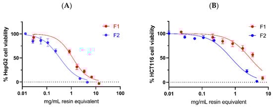 Cell viability in the HepG2 (A) and HCT116 (B) cancer cell lines following treatment with Pickering emulsions F1 and F2 for 24 h. The values represent the mean ± SD of triplicate measurements.