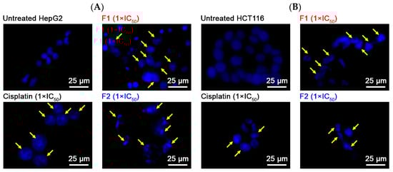 Fluorescent microscopy was conducted on HepG2 (A) and HCT116 (B) cells stained with DAPI after being exposed to Pickering emulsions F1, F2, and cisplatin (positive control) at their respective IC50 concentrations for 24 h. The 1 × IC50 values for F1 and F2 against HepG2 cells were 1.25 and 0.92 mg/mL, respectively. Against HCT116 cells, the 1 × IC50 values for F1 and F2 were 3.45 and 1.77 mg/mL, respectively.