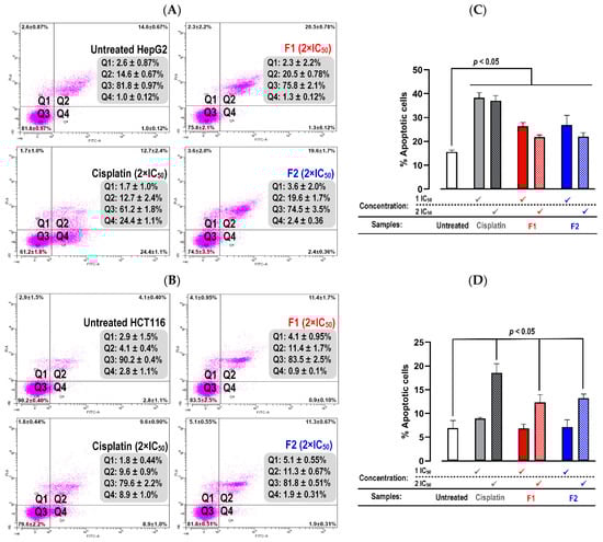 Apoptotic cell death induced by Pickering emulsions F1 and F2. Dot plots illustrate the mode of cell death in HepG2 (A) and HCT116 (B) after 24 h of F1 and F2 treatment. Quadrants 1 (Q1) to 4 (Q4) indicate necrosis, late apoptosis, viable cells, and early apoptosis, respectively. Total apoptotic cell death in HepG2 (C) and HCT116 (D) after F1 and F2 treatment for 24 h was quantified. Values are presented as the mean ± SD of triplicate measurements, and significance was determined at a p-value < 0.05. The 2 × IC50 values for F1 and F2 against HepG2 cells were 2.50 and 1.84 mg/mL, respectively. Against HCT116 cells, the 2 × IC50 values for F1 and F2 were 6.90 and 3.54 mg/mL, respectively.