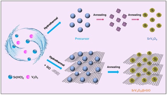 The preparation scheme for SrV4O9 and the SrV4O9@rGO composite.