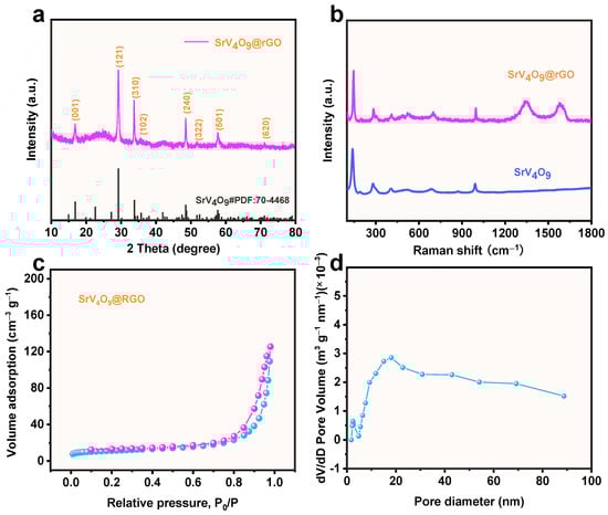 (a) XRD pattern of the SrV4O9@rGO composite. (b) Raman spectra of SrV4O9 and SrV4O9@rGO. (c) N2 adsorption–desorption isotherms of SrV4O9@rGO. (d) Pore size distribution of SrV4O9@rGO.