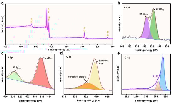 XPS is a powerful analytical technique for characterizing the chemical composition and oxidation state of materials. The importance of XPS lies in its ability to provide detailed information about the chemical composition of the SrV4O9@rGO composite at the atomic level. Figure 4a shows the XPS survey spectrum of the SrV4O9@rGO composite, which shows the photoemission characteristics of Sr, V, O, and C. The high-resolution spectrum of Sr 3d (Figure 4b) can be deconvoluted into Sr2+ 3d5/2 (135.6 eV) and Sr2+ 3d3/2 (133.2 eV) [23]. The V 2p high-resolution spectrum (Figure 4c) can be deconvoluted into V4+ 2p1/2 (523.6 eV) and V4+ 2p3/2 (516.6 eV) [39,40]. The high-resolution spectrum of O 1s (Figure 4d) exhibits two peaks, at 531.6 eV and 530.4 eV; the peak at 530.4 eV corresponds to the bonding of adsorbed oxygen on the surface of the SrV4O9@rGO composite with Sr and V, denoted as Sr–O–V [23], while the peak at 531.8 eV was likely due to the presence of H2O. As shown in Figure 4e, the high-resolution spectrum of C 1s reveals distinct peaks at 285.6 eV and 284.8 eV, corresponding to C–O and C–C bonds, respectively [41,42].