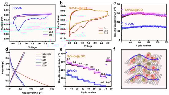 Figure 5a,b compare the CV curves of SrV4O9-based and SrV4O9@rGO-based electrodes for the first three cycles between 0.01 and 3.0 V at a scan rate of 0.1 mV s−1. All CV curves exhibited two reduction peaks and one oxidation peak. Two reduction peaks appeared at ~0.75 V and ~0.45 V, representing the penetration of sodium ions into SrV4O9. A weak and broad oxidation peak at around 1.48 V might correspond to the oxidation reaction of V. And the CV curves of the second and third cycles showed a high degree of overlap, indicating good reversibility of the electrochemical reactions. It is worth noting that the peak current densities of the oxidation–reduction peaks of the SrV4O9@rGO-based electrode (Figure 5b) were higher than those of the SrV4O9-based electrode (Figure 5a), indicating the improved electron/ion transport kinetics of the SrV4O9@rGO composite facilitated by rGO and more dispersed SrV4O9. The cycling performances of the SrV4O9-based and SrV4O9@rGO-based electrodes at 0.2 A g−1 are shown in Figure 5c. The SrV4O9@rGO composite showed a high initial reversible capacity of 284.4 mAh g−1 and maintained a stable capacity of 273.4 mAh g−1 after 200 cycles, with an ultra-high capacity retention of 96.1%. For the SrV4O9 electrode, the capacity after 200 cycles was only 142.5 mAh g−1. The excellent cycling performance can be attributed to the super aspect ratio of the porous microflower structure, which facilitated ion transfer. The introduction of rGO increased the specific surface area involved in the reaction, providing more reaction sites. The galvanostatic charge–discharge (GCD) curves of the SrV4O9@rGO electrode are shown in Figure 5d. These GCD curves show a high degree of overlap, indicating excellent cycling performance of the SrV4O9@rGO electrode. To characterize the positive effect of rGO on SrV4O9, an EIS test was performed. Figure S1 shows Nyquist plots for SrV4O9 and SrV4O9@rGO electrodes in the initial state and the SrV4O9@rGO electrode after 200 cycles. The SrV4O9@rGO electrode exhibited a smaller charge transfer resistance than the SrV4O9 electrode in the initial state, indicating that rGO improved the rate of Na+ transfer. A comparison between the initial and cycled electrodes revealed a significant decrease in impedance for the SrV4O9@rGO electrode after 200 cycles at 0.2 A g−1 due to the considerably enhanced ion and electron transfer in the electrode. The SEM image of the SrV4O9@rGO electrode after 200 cycles (Figure S2) revealed that the SrV4O9@rGO electrode had good structural stability after electrochemical testing. The SrV4O9@rGO electrode also demonstrated excellent rate performance (Figure 5e). At 0.1, 0.2, 0.5, 1.0, 2.0, 5.0, and 10.0 A g−1, the specific capacities of the SrV4O9@rGO electrode remained at 287.1, 268.5, 250.4, 228.7, 209.6, 168.2, and 120.4 mAh g−1, respectively, which were significantly higher than those of the SrV4O9 electrode (149.4, 119.0, 85.6, 69.2, 47.3, 23.1, and 7.7 mAh g−1, respectively). The cycling performance of the SrV4O9@rGO composite at a high rate (1 A g−1) was also tested, and results are shown in Figure S3. The SrV4O9@rGO composite delivered an initial reversible discharge capacity of 278.3 mAh g−1 at 1.0 A g−1. The capacity decreased slightly to 265.7 mAh g−1 after 310 cycles, demonstrating good cycling performance at a high rate. The improved electrochemical performance of the SrV4O9@rGO composite can be attributed to the large aspect ratio of the composite and improved electrical conductivity [43,44] (Figure 5f).