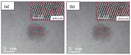 TEM analysis indicated that the CQDs presented an approximately spherical nano-morphological distribution with a nanometer size. The CQDs had a good in-plane lattice with a spacing less than 0.3 nm (Figure 1a), which is close to the (101) plane of graphite. The CQD/TiO2 had a good crystal plane spacing that was similar to that of TiO2, and the diameter of the CQDs had no obvious effect on the morphology of the TiO2. This indicates that there was a good binding structure between the CQDs and TiO2. Meanwhile, after embedding CQDs into TiO2, the lattice spacing of the CQD/TiO2 composite was determined to be more than 0.3 nm (Figure 1b).