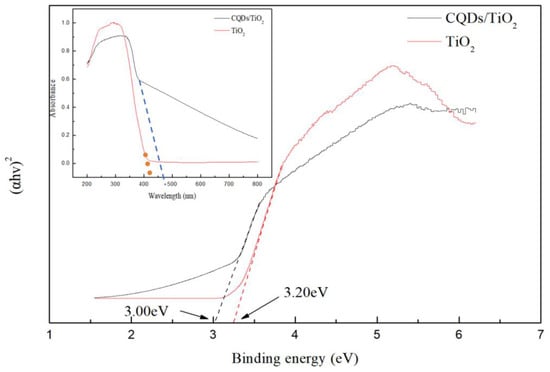 In the ultraviolet wave band, the light absorption of CQD/TiO2 is less than that of TiO2, but in the visible light region, the light absorption of the CQD/TiO2 composite material is greatly enhanced compared with that of TiO2 (Figure 2). Because the CQDs exhibit a higher LUMO (lowest unoccupied molecular orbital) energy level than the TiO2, the electrons excited by visible light can be easily transferred from the LUMO energy level to the CB of TiO2, and the absorption intensity of the CQDTiO2 is much higher than that of TiO2 in the visible region [32]. The threshold wavelengths (λg) of the absorption spectra of simple TiO2 are obviously lower than those of the CQD/TiO2 composite, which is due to the near-infrared absorption characteristics of the CQDs [33] (Figure S3 in the Supplementary Materials). The light absorption red-shift and range broadening significantly indicated the promotion of the photocatalytic performance [34]. Further calculations also showed that the binding energy of the CQD/TiO2 (3.00 eV) was lower than that of TiO2 (3.20 eV), which means that more excited electrons transferred from the VB to the CB; this led to the promotion of the photo-absorption of the composite. That is to say, the red-shift performance of CQDs and their tight combination with TiO2 can effectively promote the red-shift of the absorption wavelength and effectively inhibit the recombination of electrons and holes. The band gap of CQDs/TiO2 is reduced relative to that of pure TiO2, and the interfacial interaction between CQDs and TiO2 leads to the redistribution or rearrangement of electron energy levels [35]. Especially, the biomass origin of CQDs results in a significant number of surface traps for electrons or holes, influencing the band structure of the composites. Therefore, surface modifications may further be considered to adjust the band gap width.