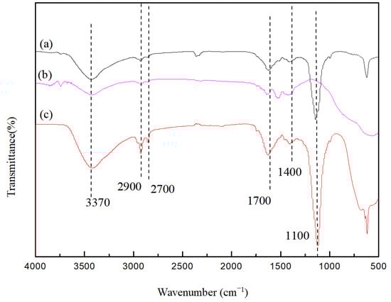 The FTIR spectra of different materials are illustrated in Figure 3. In the FTIR spectra, the broad and strong absorption band peak at 3370 cm−1 is assigned to the -OH stretching vibration, and the absorption peaks at 2900 cm−1 and 1700 cm−1 are the stretching vibration peaks of C-H and C=O, respectively. The conjugate characteristic absorption peak produced by C=C appears near 1400 cm−1, and the absorption peak at 650–900 cm−1 may be the benzene ring hydrogen absorption peaks of in-plane, out-of-plane, and benzene ring skeleton-bending vibration. The FTIR analysis indicates that carbonaceous groups were introduced on the surface of the TiO2, thus confirming the formation of the CQD/TiO2 composite. Meanwhile, the combination of CQDs enhances the absorption intensity of the Ti-O bond at 1100 cm−1, and this peak is the characteristic absorption peak of the Ti-O bond. In addition, the CQD/TiO2 shows a strong capacity for absorption when the wave number is lower than 1000 cm−1, which may be related to the increased distance between atoms or lattices and the characteristic absorption peaks of Ti-O-C.