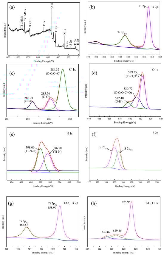XPS spectra of CQD/TiO2 composite materials: (a) full spectrum; (b) Ti 2p spectrum; (c) C 1s spectrum; (d) O 1s spectrum; (e) N 1s spectrum; (f) S 2p spectrum; (g) Ti 2p spectrum of TiO2; (h) O 1s spectrum of TiO2.