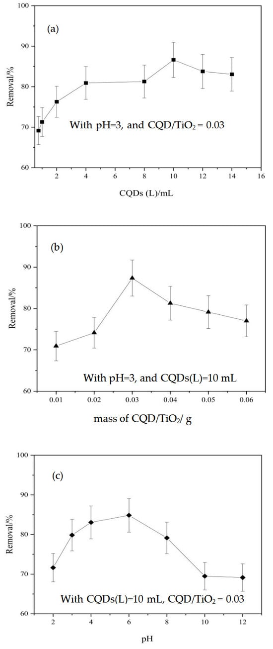 Effect of photocatalytic degradation of CQD/TiO2 on naphthalene. (a) CQDs; (b) mass of CQDS/TiO2; (c) pH.