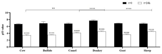 The pH values of all samples before and after fermentation are reported in Figure 1. The results showed that there was a significant reduction in pH in all samples (**** p < 0.0001) after fermentation compared with the pH values of the corresponding starting milks. The pH values of kefirs ranged from 3.40 ± 0.20 for cow to 4.50 ± 0.20 for donkey and sheep samples. Also, the values obtained after fermentation were compared with cow kefir ones, and significant differences were found for kefirs from camel (4.10 ± 0.20, ** p < 0.01), donkey (4.50 ± 0.10, **** p < 0.0001), and sheep samples (4.50 ± 0.20, **** p < 0.0001).