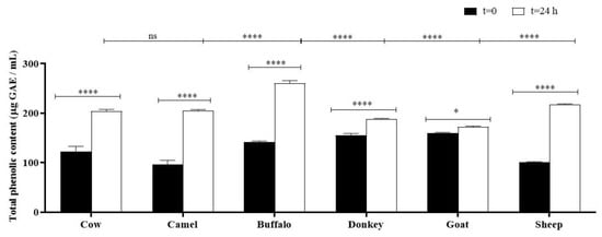 Total phenolic content of unfermented (t = 0, black) and fermented samples (t = 24 h, white). Asterisks on the histograms (* p < 0.05 and **** p < 0.0001) show the significance of TPC values after fermentation. Asterisks on the lines (**** p < 0.0001) highlight the significance of buffalo, donkey, goat, and sheep kefirs vs. cow kefir (control); ns: not significant value.