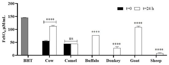 Also, the conversion potential of the oxidized form of iron (Fe3+) to the reduced form (Fe2+) was used to determine the reducing power (RP) of fermented milks. The Fe2+ amount can be monitored through spectrophotometry by quantification of Perl Prussian blue at 700 nm. A high absorbance value of the sample indicated a strong RP value. With the exception of the cow sample, for which the RP value doubled after fermentation (**** p < 0.001), and the camel sample, which exhibited the same value of RP at times 0 and 24 h, in the other samples of different origins the fermentation process significantly increased the reducing activity compared with the milk values, with a reducing power of 0 (**** p < 0.001). Proteins and peptides could be responsible for increased reducing activities after fermentation, as reported by Wang et al. [,], but, since there was no simultaneous increase in buffalo and goat proteins during the fermentation, the increased reducing capacity must necessarily be attributed to compounds of a different nature. The ferrous-reducing capacity of cow milk was higher than that reported by Baniasadi et al. []. This difference could be attributed to the different microbial populations of kefir grains and the fact that they performed the assay on the methanolic extract of fermented samples and not on the kefir as such.