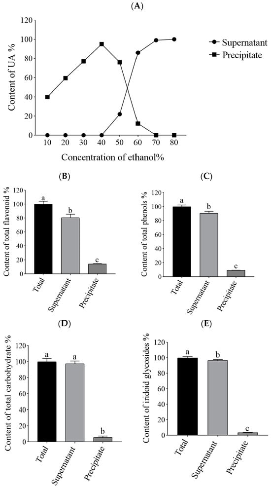 Distribution of various components in the supernatant and precipitate. (A) The proportion of UA content in the supernatant and precipitate when the crude extract of Cornus officinalis was diluted to different ethanol concentrations. (B) The proportion of total flavonoid content in the supernatant and precipitate when the crude extract of Cornus officinalis was diluted to 40% ethanol concentration. (C) The proportion of total phenols content in the supernatant and precipitate when the crude extract of Cornus officinalis was diluted to 40% ethanol concentration. (D) The proportion of total carbohydrate content in the supernatant and precipitate when the crude extract of Cornus officinalis was diluted to 40% ethanol concentration. (E) The proportion of total iridoid glycosides content in the supernatant and precipitate when the crude extract of Cornus officinalis was diluted to 40% ethanol concentration. Significantly different letters within each pairwise column indicate statistical significance (p < 0.05).