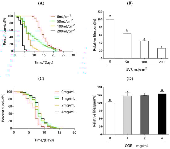 Effects of UVB doses on the lifespan of C. elegans and the effect of COE on the lifespan of C. elegans under UVB 100 mJ/cm2. (A) The lifespan of C. elegans under UVB irradiation, n > 70. (B) Relative lifespan of C. elegans exposed to UVB. (C) Effect of COE on the lifespan of C. elegans exposed to UVB 100 mJ/cm2. The treated nematodes were cultured with OP50 for 24 h and then exposed to UVB, n > 70. (D) Effect of COE on the relative lifespan of C. elegans exposed to UVB 100 mJ/cm2. A significant difference (p < 0.05) was observed between each column pair, as denoted by distinct letter labeling.