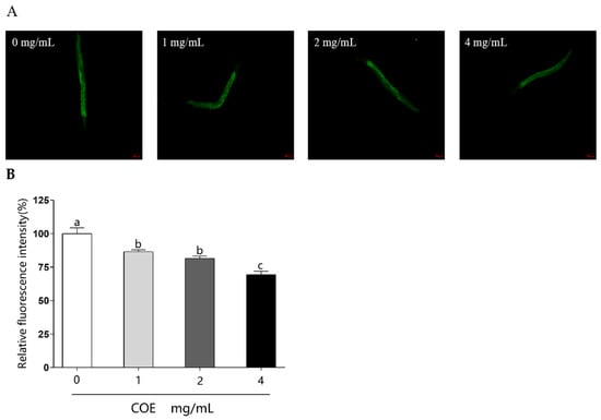 UVB radiation could cause a large accumulation of ROS [7]. Overexpression of ROS levels could activate signaling pathways that result in a series of oxidative stress reactions, which finally leads to skin photodamage [17]. Therefore, exploring strategies for decreasing the levels of ROS is an important area of anti-photoaging. The 2, 7-dichlorodihydrofluorescein diacetate (DCFH-DA) reagent was used to detect the ROS levels in nematodes exposed to UVB radiation stress. As shown in Figure 3, ROS level, indicated by fluorescence intensity, was significantly decreased in a dose-dependent manner in the worms treated with COE. Compared to the untreated group, the ROS levels in the treatment groups of COE were reduced to 92.27%, 81.57%, and 69.44%, respectively. The results indicate that COE could significantly reduce the overexpression of ROS caused by UVB.