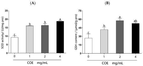 COE on the antioxidant enzyme activities in C. elegans exposed to UVB. The treated nematodes were cultured with OP50 for 24 h and then exposed to UVB, n > 1000. (A) SOD activity. (B) GSH content. Values with different letters in column for each figure are significantly different (p < 0.05).
