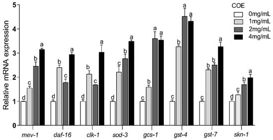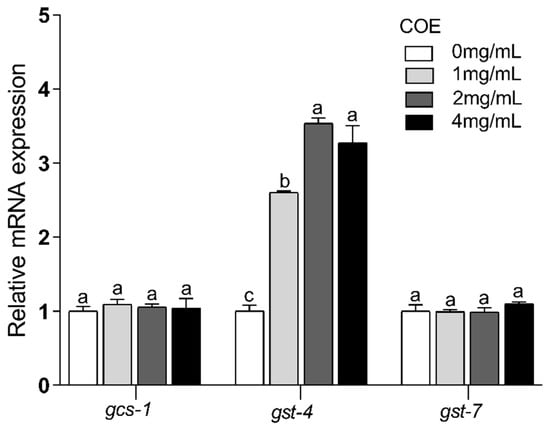 Effect of COE on oxidative stress-related genes expression in C. elegans exposed to UVB. The treated nematodes were cultured with OP50 for 24 h and then exposed to UVB, n > 1000. Bars of the same gene with different letters are significantly different (p < 0.05).