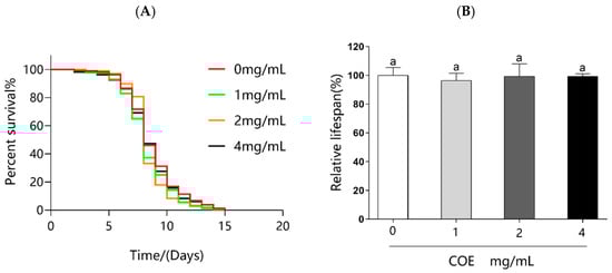 To determine the effect of COE on photoaging, the worms were cultured on NGM plates containing 0, 1, 2, and 4 mg/mL COE, and their lifespan was measured after being exposed to UVB radiation. Figure 2C,D show the effect of COE on the lifespan of C. elegans under UVB radiation. Compared to the COE-untreated nematodes, 1, 2, and 4 mg/mL COE significantly prolongs the lifespan of the nematodes by 22.39%, 23.33%, and 28.77%, respectively. The lifespan assays of nematodes in the COE-treated groups were significantly longer after exposure to UVB, indicating that the COE had a significant UVB protective effect on the nematodes. However, COE protected C. elegans from UVB-induced damage in a dose-independent manner.