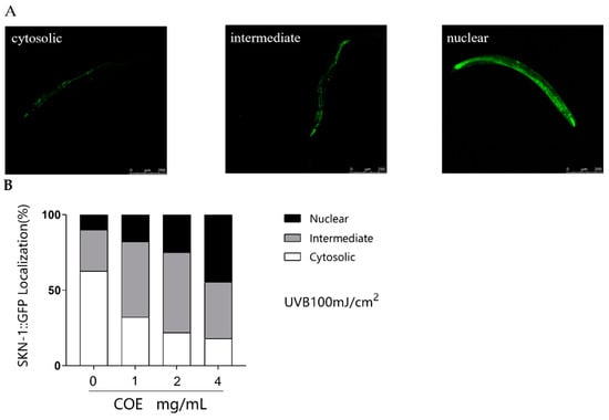 In order to test the impact of COE on the intracellular localization of SKN-1 under oxidative stress caused by UVB, we employed a transgenic C. elegans strain stably expressing a SKN-1::GFP fusion protein. GFP was used to reflect this translocation in the present study. As shown in Figure 7A,B, COE treatment induces a reduction in cytosolic SKN-1::GFP fraction from 62.50% to 17.85% and an increase in nuclear SKN-1::GFP translocation from 10.00% to 44.64%. This phenomenon shows that COE treatment can affect the subcellular distribution of SKN-1 and induce a partial translocation of SKN-1 to the nucleus from the cytoplasm after being exposed to UVB radiation.