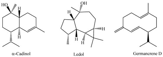 Sesquiterpenes are classes of compounds found in nature, which are present in both aromatic plants and marine life [41]. In this research, these organic compounds were found to be predominant in the essential oils of various species such as Myrcia eximia (Specimen B) [5], M. hatschbachii [42], M. loranthifolia [43], M. multiflora (Specimen A, B and C) [4], M. oblongata [44], M. sylvatica [10,45], M. rostrata [46], M. splendens [47,48], M. vitoriana [49], and finally, the samples of M. tomentosa [3,50].
