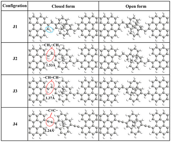 The schematic diagram of the molecular junction in this work is shown in Figure 1b. The molecular junction can be divided into three parts: the left electrode, the central region and the right electrode. Obviously, there are four bridging configurations of DHP/CPD contacted to zigzag graphene nanoribbon (ZGNR) electrodes as shown in Figure 2. The bridging manners are named as J1, J2, J3 and J4 configuration respectively, where J3 is the bridging manner adopted by Han et al. in similar DHP/CPD molecular junctions [26]. The closed/open forms of J1 to J4 configurations of the molecular junctions are denoted as J1c/J1o to J4c/J4o for convenience. It is evident that J1 and J2 exhibit distinct electrode edge structures, wherein a vacancy at the C atom at the electrode in J2 exists, with all connected C atoms being saturated by H atoms. Meanwhile, J2, J3 and J4 share identical electrode edge structures, except for the bonding between the molecule and the GNR electrodes via C-C, C=C and C≡C bonds, and the optimized bond lengths are 1.53 Å, 1.37 Å and 1.24 Å respectively. These values directly reflect variations in bridging strength between the molecule and the electrodes. Consequently, we can investigate how the electrode edge structure and covalent bond strength between molecule and electrode influence the transport behavior through the four different bridging manners.