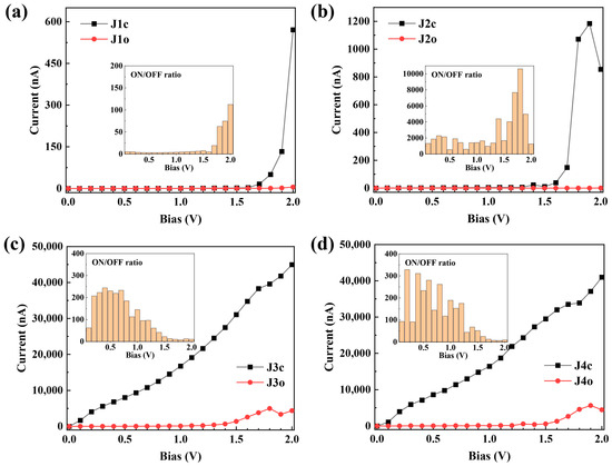 The calculated current–voltage (I–V) characteristics of the molecular junctions in the bias voltage range of [0, 2.0 V] are presented in Figure 3. It can be observed that the current values of J1c and J2c gradually increase between 0 V and 1.5 V before experiencing a rapid increase beyond 1.5 V (Figure 3a,b). J1o and J2o exhibit negligible current variations throughout the entire bias range. The current of J3c demonstrates a noticeable increase across the entire bias range, while the current of J3o exhibits a slower trend compared to J3c and only shows significant enhancement when the bias exceeds 1.3 V (Figure 3c). Similar variations in current values are observed for J4c and J4o as seen for J3. Notably, both J1 and J2, where molecules are connected to electrodes via CH2 groups, exhibit, as expected, significantly lower currents than J3 and J4, which are connected via conjugated groups. For instance, at a bias voltage of 2.0 V, the current values for ring-closed configurations (J1c~J4c) are 571 nA, 855 nA, 44,960 nA and 41,000 nA, respectively. With only a difference in bridging strength, the tunneling current in J3c is more than 52 times larger than that in J2c at a bias voltage of 2.0 V alone. Moreover, the current magnitude flow through J3c is nearly 80 times greater than that through J1c. For the ring-open configuration, the current values of J1o~J4o are 5 nA, 0.7 nA, 4366 nA and 4350 nA, respectively. The bridging manner exhibits a current modulation exceeding three orders of magnitude, particularly with J3o and J4o displaying even higher currents than J1c and J2c. This result suggests that the electronic conductance of DHP/CPD molecular junctions is significantly influenced by the manner in which they are bridged.