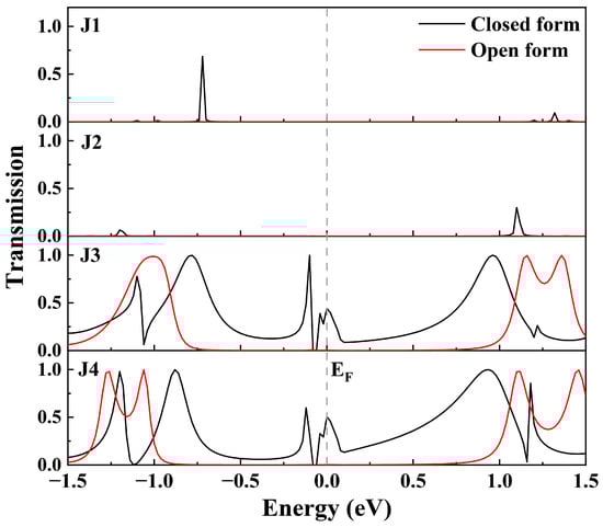 Transmission spectra of the closed form and open form for J1~J4 junctions at zero bias. The EF is set at zero on the energy scale.