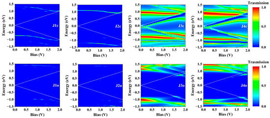To elucidate the origin of the conductance disparity among the molecular junctions, we have performed calculations on the zero-bias transmission spectra (Figure 4) and the bias-dependent transmission spectra (Figure 5) of J1~J4. As shown in Figure 4, both J1c and J2c exhibit two distinct narrow transmission peaks within the energy range [−1.5, 1.5 eV], which are significantly distanced from the EF, indicating their limited conductance at low bias voltage. With the increase of bias voltage, the transmission peaks around 1.2 eV of J1c and J2c gradually shift towards and eventually enter into the bias window after reaching 1.5 V, resulting in a rapid increase in current flow (as shown in Figure 3a,b). Conversely, no discernible transmission peak is observed within the energy range [−1.5, 1.5 eV] at zero bias for either J1o or J2o (Figure 4), even when the bias increases to 2.0 V, hence explaining their low conductance within the [0, 2.0 V] bias range (Figure 3a,b). In contrast, multiple broad and strong transmission peaks can be identified in the spectra of J3c and J4c and, in particular, the peaks at EF play a major role in low-bias electronic transport (Figure 4). With an increasing bias voltage, the transmission peak at EF for J3c and J4c splits into two distinct peaks, which remain within the bias window while exhibiting enhanced intensity and width; this is the driving force behind the continuous increase in current flow through J3c and J4c (Figure 5). It is noteworthy that, despite the utilization of diverse simulation details, the transmission spectral characteristics of J3 exhibit consistency with the computational findings reported by Han et al. for similar molecular junctions [26], thereby substantiating the reliability of our calculations. In contrast, the transmission spectra of J3o and J4o exhibit no transmission peaks at low biases within the bias window (Figure 5). However, after reaching 1.5 V, two transmission peaks at about -0.8 eV and 0.7 eV enter the bias window, thereby enhancing the current under high bias conditions and reducing the ON/OFF ratio in J3 and J4 (Figure 3c,d). Consequently, it is evident that the transmission spectra of J1 and J2 differ significantly from those of J3 and J4, indicating that both the broadening and intensity of the transmission peaks depend on the bridging manner. In addition, despite having different bonding strengths, similar conductive properties are observed between J3 and J4 due to their comparable transmission spectra.