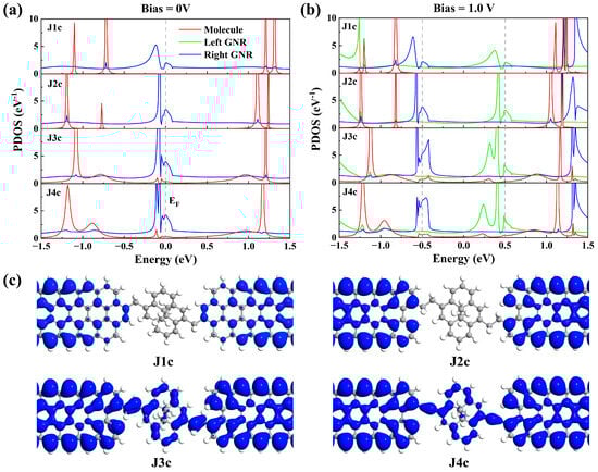 Projected density of states (PDOS) spectra for the central region of J1c~J4c junctions when the bias voltage is set to 0 V (a) and 1.0 V (b). The projection subspace of the scattering region can be divided into three parts, i.e., the left GNR (including the left bridging group), the molecule and the right GNR (including the right bridging group). Local density of states (LDOS) for the central region at EF under 0 V bias (c). An isovalue of 0.005 is chosen for all plots.