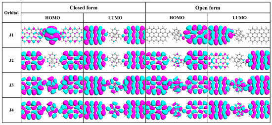 Furthermore, the self-consistent Hamiltonian of J1~J4 junctions are projected onto the central regions to calculate the spatial distribution of frontier molecular orbitals to display the interaction between the GNR electrodes and the DHP/CPD molecule more clearly (as shown in Figure 7). It is clear that the HOMO and LUMO of J1 and J2 junctions, including the closed and open form, are predominantly localized at the electrodes or molecule segment, which serve as nonconducting channels. Conversely, both the HOMO and LUMO of J3 and J4 exhibit delocalization across the entire junction, enabling more efficient electron transport. It is worth noting that the orbitals localized on the molecule (the HOMO of J1c) are delocalized on the molecular moiety, and those localized on the electrode (the other orbitals of J1 and J2) are also delocalized on their respective electrode parts, thus indicating that their localization characteristics primarily depend on the bridging group. The spatial distribution of frontier molecular orbitals closely resembles that of the LDOS distribution of J1c~J4c (Figure 6c), further demonstrating that the bridging CH2 group can weaken the molecule-electrode interaction, while conjugated CH=CH and C≡C groups facilitate stronger molecule-electrode coupling.