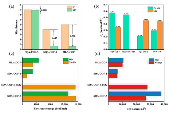 (a) Expected and actual slippage distance of SQA-COF-5, SQA-COF-1 and MLA-COF; (b) specific volume electron energy, (c) electron energy and (d) unit cell volume of SQA-COF-5, SQA-COF-5-PEG, SQA-COF-1 and MLA-COF.