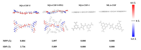 Planarity is a very important parameter for structures with π-π stacking interactions [19]. The molecular planarity parameter (MPP) and span of deviation from plane (SDP) were specific to judge the planarity. For both MPP and SDP, the smaller the better, with MPP reflecting the overall stability of the region and SDP reflecting the degree of atomic deviation on both sides of the fitted plane. In Figure 6, it can be seen that the MPP and SDP values of SQA-COF-5 and SQA-COF-5-PEG are larger than those of SQA-COF-1 and MLA-COF, indicating poorer planarity for SQA-COF-5 and SQA-COF-5-PEG. Meanwhile, after the introduction of PEG, both MPP and SDP increase, indicating that the added PEG does not favor the improvement of planarity. It is worth noting that after the introduction of the planar and conjugated units triazine and melamine, the MPP and SDP of SQA-COF-1 and MLA-COF are both zero, representing an ideal absolute plane. This indicates that the introduction of conjugated amine building units is beneficial for enhancing the planarity of the benzene series COFs.