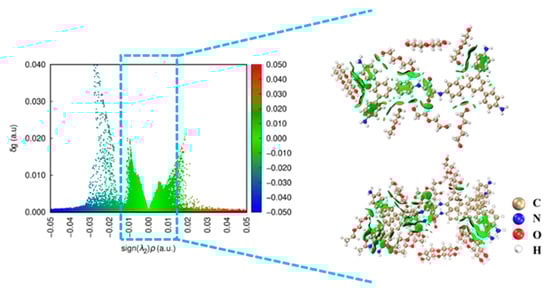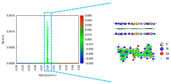 Before calculating the interactions, the primitive cell was expanded to a 1 × 1 × 2 supercell, and the wave function was obtained using the xtb 6.4.1 software at the GFN2 computational level. Then, Multiwfn 3.8 was used to analyze the weak interactions within the system based on the independent gradient model based on Hirshfeld partition (IGMH). It was a more universal new method proposed by Lu Tian et al. [20]. In 2008, Grimme revealed that the essence of the π-π interaction is the dispersion interaction, a type of van der Waals force, corresponding to the part of the IGMH theory where the electron density is approximately zero [21]. Figure S3 shows the basis for judgment in the IGMH method. IGMH analysis was performed on SQA-COF-5, SQA-COF-5-PEG, SQA-COF-1, and MLA-COF (Figure 7, Figure 8, Figure 9 and Figure 10). In Figure 7, the relationship between the electron density gradient difference (δg) and the electron density shows that δg is very small at ρ = 0, indicating that SQA-COF-5 has a weaker π-π interaction. Its isosurface map also shows that the π-π interaction in SQA-COF-5 is non-planar, further confirming the weak π-π interaction of SQA-COF-5. Although the electron density gradient difference δg at ρ = 0 for SQA-COF-5 is small, it is larger than that for SQA-COF-5-PEG, suggesting that SQA-COF-5 has a better stacking effect than SQA-COF-5-PEG. Notably, in Figure 8, the relationship between the electron density gradient difference and the electron density shows a significant δg value on both sides of ρ = 0 (−0.01~0.01 a.u.), and combined with its isosurface map, it is evident that hydrogen bonds are formed in SQA-COF-5-PEG, which also contributes to the stabilization of the COF framework from another aspect. As shown in Figure 8 and Figure 10, both SQA-COF-1 and MLA-COF have concentrated δg values at ρ = 0, and their isosurface maps indicate that they have very strong π-π interactions between layers, which can stabilize the COF framework.