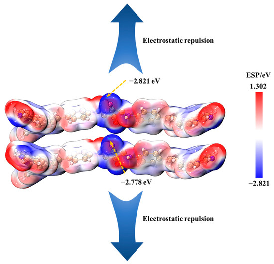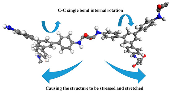 Through the above analysis of slippage, planarity, and weak interactions, it is evident that SQA-COF-1 and MLA-COF have stronger stacking effects than SQA-COF-5. Furthermore, we calculated the electrostatic potential (ESP) of SQA-COF-5, as shown in Figure 11. The negative potential is concentrated on the oxygen atoms in the single layer, and the positive potential is concentrated nearby. The large electrostatic repulsion between layers can weaken the π-π interaction, making slippage more likely to occur. On the other hand, the internal rotation of the C-C single bond in the SQA-COF-5 nodal unit, as shown in Figure 12, is under tensile stress in the single-layer structure, and the arrangement between layers is irregular, leading to poor stacking.