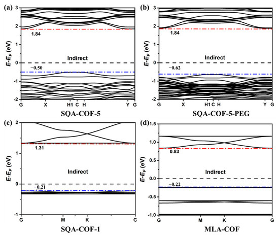 Band structures of (a) SQA-COF-5, (b) SQA-COF-5-PEG, (c) SQA-COF-1, and (d) MLA-COF.