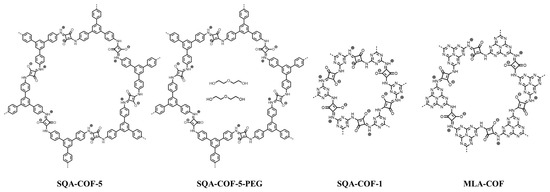Structures of SQA-COF-5, SQA-COF-5-PEG, SAQ-COF-1, and MLA-COF.