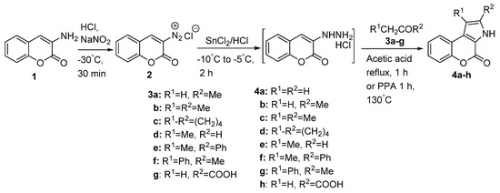 In 1978, Khan and de Brito Morley reported for the first time the synthesis of substituted fused pyrrolo[3,4-b]coumarins 4b–h via the Fischer indolization of in situ prepared coumarin-3-hydrazine hydrochloride with carbonyl compounds 3a–g in 33–51% yield [70]. The intermediate hydrazine hydrochloride was prepared by the reduction, with stannous chloride, of 3-coumarin diazonium salt (2) synthesized by diazotization of 3-aminocoumarin (1) at −30 °C (Scheme 1).