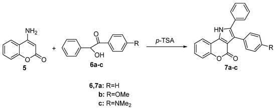 Joshi et al. presented the synthesis of the 2,3-diaryl-4(H)-oxo[1]benzopyrano[4,3-b]pyrroles 7a–c by the reaction of 4-aminocoumarin (5) with benzoins 6a–c in the presence of p-toluene sulfonic acid (Scheme 2). These novel compounds produced a strongly fluorescent green solution in alkali [71].