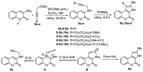 Majumdar and Chattopadhyay prepared the pyrrolocoumarin derivatives 4b, 10a–d in excellent yield of 90–94% from the regioselective aza-Claisen rearrangement of 3-N-propargylaminocoumarin (9a) and 3-N-(aryloxybut-2-ynyl)aminocoumarins 9b–e (Scheme 3). An initial [3,3]-sigmatropic rearrangement of propargylamine moiety of 9a gave allene intermediate A, followed by a tautomerism to amine B. A subsequent 5-exo-trig cyclization resulted in the final product 4b. Starting compounds 9a–e was synthesized by refluxing 3-aminocoumarin (1) with propargyl bromide (8a) or 1-aryloxy-4-chlorobut-2-ynes 8b–e, respectively, in anhydrous ethyl methyl ketone [72].