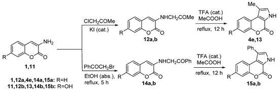 Soman et al. synthesized chromeno[3,4-b]pyrrol-4(3H)-ones 4e, 13 and 15a,b in 28–68% yield through cyclization, in the presence of catalytic amount of TFA, of 3-N-ketonylcoumarins 12a,b and 14a,b, respectively, which were obtained by the reaction of 3-aminocoumarins 1, 11 with a-haloketones (Scheme 4). The compounds 4e, 13 was tested for their cytotoxic activity using the MTT [3-(4,5-dimethylthiazo-2-yl)-2,5-diphenyl-2H-tetrazolium bromide] against cell lines of colon, lung, and breast cancer. Both compounds showed good activity against all the above cell lines [39].