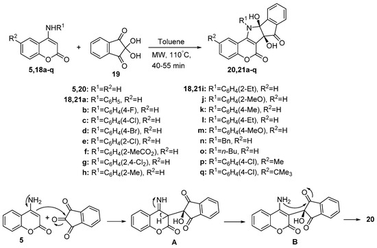 Chen et al. presented a regioselective synthesis of dihydrochromenoindeno[1,2-b]pyrroles 20, 21a–q in 70–92% yield via the reaction of N-substituted 4-aminocoumarin derivatives 5, 18a–q with ninhydrin (19) under microwave irradiation without the presence of a catalyst [74]. Nucleophilic addition of 4-aminocoumarin (5) to the more electrophilic middle carbonyl of indanetrione, which is in equilibrium with ninhydrin, gave the intermediate A. Tautomerization of A resulted in B. The addition of amine to one of the carbonyls led to the final product 20 (Scheme 6).