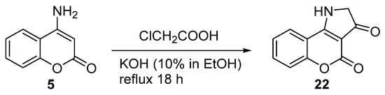 Ibrahim et al. reported that the reaction of 4-aminocoumarin (5) with chloroacetic acid resulted in 1,2-dihydrochromeno[4,3-b]pyrrole-3,4-dione (22) in 58% yield (Scheme 7). This compound was studied for cytotoxic activity and found to be 1.5-fold more toxic than the standard 5-fluorouracil [75].