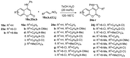 Padilha et al. used p-toluenesulfonic acid for the synthesis of chromeno[4,3-b]pyrrol-4(1H)-ones 24a–f from 4-N-phenylaminocoumarins 23a,b and β-nitro alkenes 16 under solvent-free conditions in 6–77% yield (Scheme 8). The proposed mechanism for the synthesis of compounds 24 was like the one proposed in Scheme 5 [76].