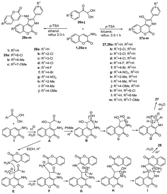 Yang et al. reported the synthesis of chromeno[3,4-b]pyrrol-4(3H)-ones through the domino reaction of 3-aminocoumarins 1, 25a–c with aryl glyoxal monohydrates 26a–j [77]. The reactions were catalyzed by p-toluenesulfonic acid (p-TSA). The solvents toluene or ethanol are important, as they affect the synthesis of the products 2-aryl-1-hydroxychromeno[3,4-b]pyrrol-4(3H)-ones 27a–m or 2-aryl-1-(2-oxo-2H-chromen-3-ylamino) chromeno[3,4-b]pyrrol-4(3H)-ones 28a–m in 54–78% or 75–92% yield, respectively (Scheme 9). In the proposed mechanistic scheme, the common intermediate A is formed by the nucleophilic attack of aminocoumarin on glyoxal. In the presence of toluene, intramolecular cyclization of A to C followed by dehydration of D led to the adduct 27. In the presence of polar solvent, ethanol, protonation of the hydroxyl group of A afforded intermediate E. Nucleophilic attack of the amine group of 3-aminocoumarin furnished intermediate F, maybe for steric reasons. Intramolecular cyclization of F to G followed by dehydration of I resulted in the product 28.