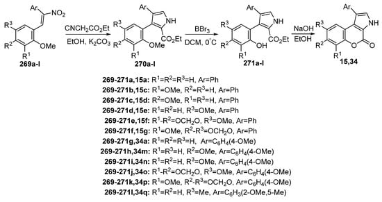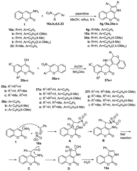 Pandya et al. reported the synthesis of pyrrolo[2,3-c]coumarins derivatives 4g, 15a, 34a–c in 51–57% yield from the reactions of 3-aminocoumarin (1) with β-nitrostyrenes 16a,b,d,k, 33 in the presence of piperidine [79]. 1(H)[1]Benzopyrano[3,4-b][1]benzopyrano[3′,4′-b]pyrrole-7(H)-ones 37a–i were synthesized also, in 51–56% yield from the reactions of 4-hydroxycoumarins 35a–c with 3-nitro-2-aryl-2H-[1]benzopyrans 36a–c in the presence of acetic acid and ammonium acetate (Scheme 12). For the mechanism, Michael addition of 3-aminocoumarin (1) to β-nitrostyrene (16a) gave intermediate B after tautomerization of A. Intermediate aldehyde C was formed next, according to Nef reaction conditions [80]. Intramolecular cyclization to D followed by elimination of water resulted in the pyrrolo[2,3-c]coumarin 15a.